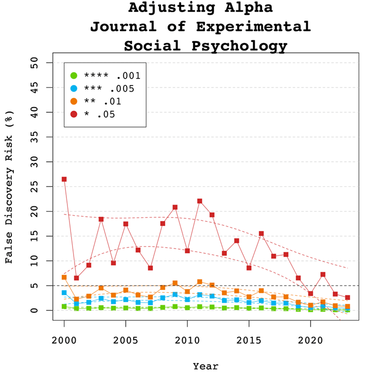 The EDR is somewhat lower, 21%, but the 95% confidence interval includes 30%. The FDR is 19%, but the lower limit of the confidence interval includes 13%. Thus, the results are a bit lower, but mostly consistent with evidence from estimates based on thousands of results. These estimates of the FDR are notably lower than the false positive rates that were predicted by Ioannidis’s scenarios that assumed high rates of true null-hypotheses.