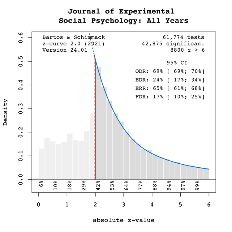 (14) “The simulation study was conducted for the performance of the z-curve on constrained scenarios including F-tests with df = 1 and not for the combination of t-tests and chi-square tests as applied in the current study. I’m not sure what to make of the z-curve performance for the data used in the current paper because the simulation study does not provide evidence of its performance under these unexplored conditions.”