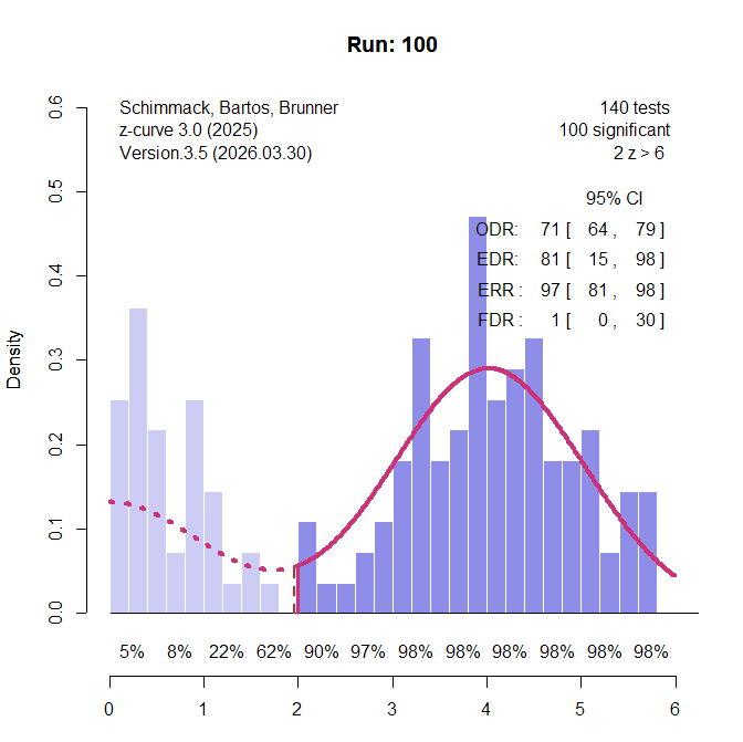 I am all in favor of open science and a critic of closed pre-publication peer-review. The downside of open communication is that there is no quality control and internet searches will amplify misinformation. This is the case with Erik van Zwet’s critique of z-curve. Even though I addressed his criticisms in the comment section, search engines – like humans – do not scroll to the end and process all information. I have even addressed concerns about z-curve.2.0 by improving z-curve 3.0 to handle edge cases like the one used by van Zwet to cast doubt about z-curves performance in general. In science, facts trump visibility Z-curve.has been validated with many simulations across a wide range of scenarios and works well even with just 50 significant z-values. For more information, check out the Replication Index blog or the FAQ about z-curve page.