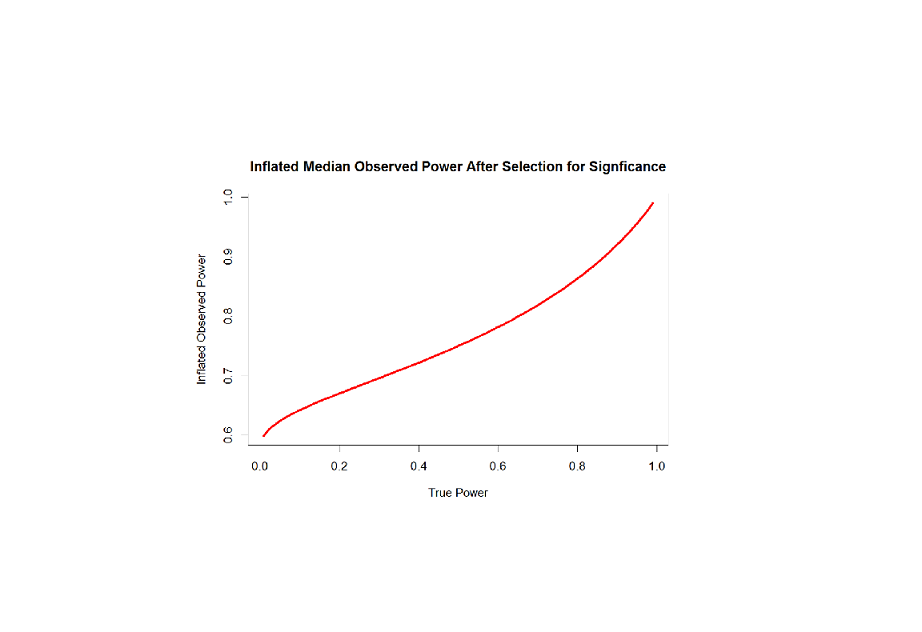 And here is a pretty picture of the relationship between true power and inflated observed power. As we can see, there is more inflation for low true power because observed power after selection for significance has to be greater than 50%. With alpha = .05 (two-tailed), when the null-hypothesis is true, inflated observed power is 61%. Thus, an observed median power of 61% for only significant results supports the null-hypothesis. With true power of 50%, observed power is inflated to 75%. For high true power, the inflation is relatively small. With the recommended true power of 80%, median observed power for only significant results is 86%.