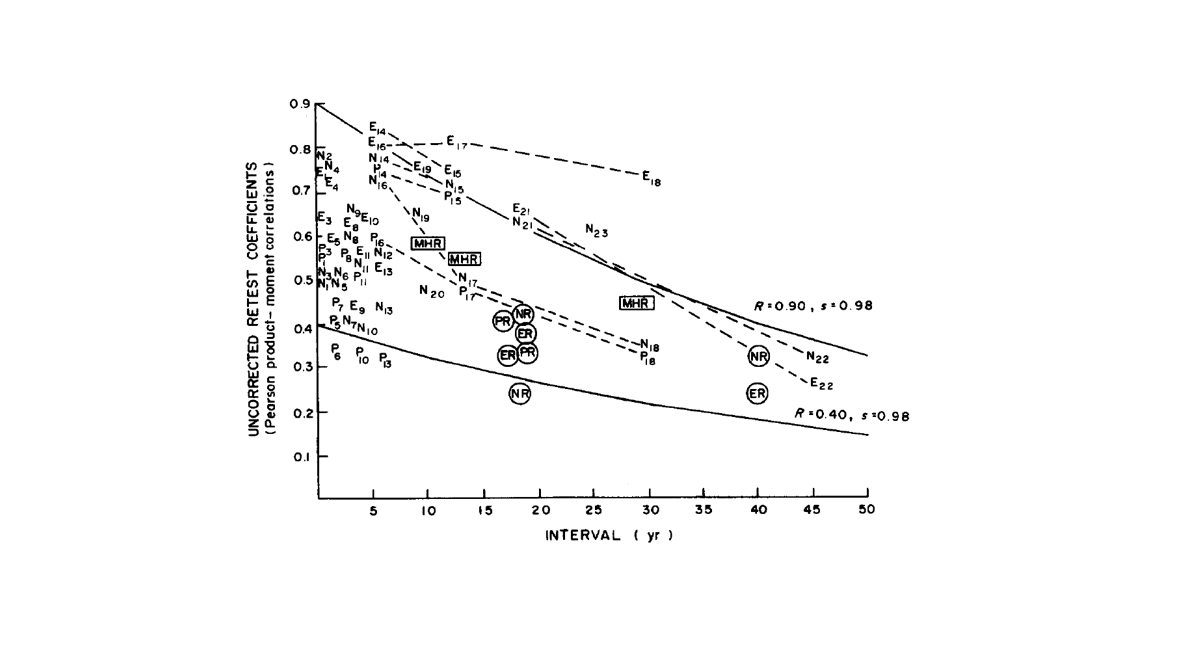 The Figure below shows Conley’s estimate for personality traits like extraversion and neuroticism. The figure shows that reliability varies across studies and instruments from as low as .4 to as high as .9. After correcting for unreliability, the estimated annual stability of personality traits is s = .98.