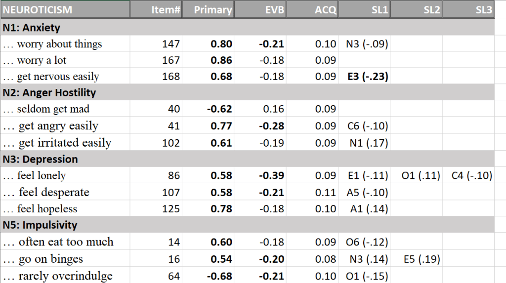 There are only a few consistent secondary loadings. This suggest that many secondary loadings may be artifacts of item-selection or participant selection. The few consistent secondary loadings make theoretical sense. Anger loads negatively on agreeableness and this facet is probably best considered a blend of high neuroticism and low agreeableness.