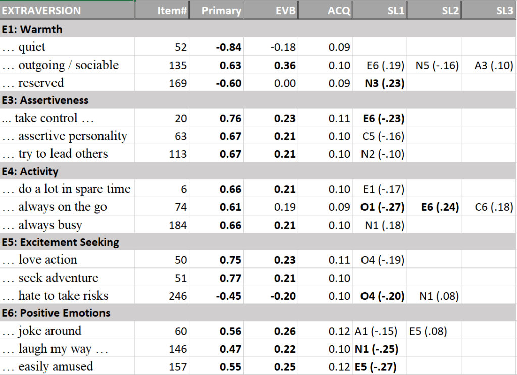 The measurement model for the extraversion facets also showed high primary loadings (Table 2).