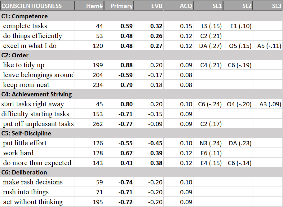 Finally, the conscientiousness facets were also clearly identified (Table 5).