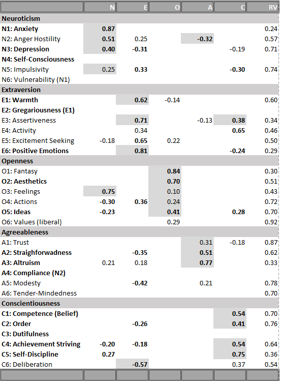 The most important result are the loadings of the 24 facets on the Big Five factors. These results are shown in Table 6. To ease interpretation, primary loadings greater than .4 and secondary loadings greater than .2 are printed in bold. Results that are consistent with the previous study of the NEO-PI-R are highlighted with a gray background.