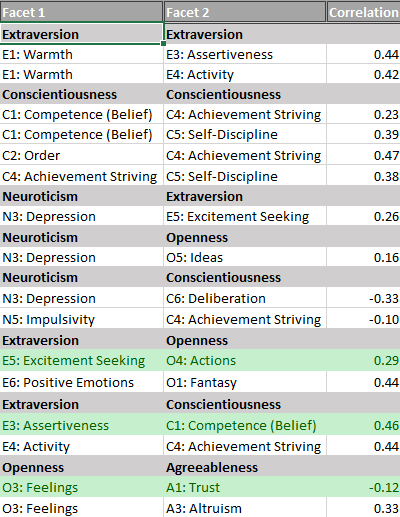 There are eight facets with inconsistent loading patterns. Activity loaded with .34 on extraversion. More problematic was the high secondary loading on conscientiousness, suggesting that activity level is not clearly related to a single Big Five trait. The results for excitement seeking were particularly different. Excitement seeking did not load at all on extraversion in the NEO-PI-R model, but the loading in this sample was high.