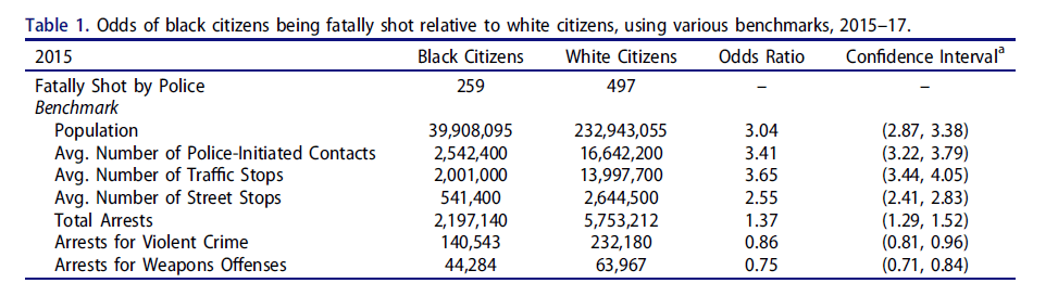 In a couple of articles, Cesario and Johnson have claimed that police officers have a racial bias in the use of force with deadly consequences (Cesario, Johnson, & Terrill, 2019; Johnson, Tress, Burkel, Taylor, & Cesario, 2019). Surprisingly, they claim that police officers in the United States are MORE likely to shoot White civilians than Black civilians. And the differences are not small either. According to their PNAS article, “a person fatally shot by police was 6.67 times less likely (OR = 0.15 [0.09, 0.27]) to be Black than White” (p. 15880). In their SPPS article, they write “The odds were 2.7 times higher for Whites to be killed by police gunfire relative to Blacks given each group’s SRS homicide reports, 2.6 times higher for Whites given each group’s SRS homicide arrests, 2.9 times higher for Whites given each group’s NIBRS homicide reports, 3.9 times higher for Whites given each group’s NIBRS homicide arrests, and 2.5 times higher for Whites given each group’s CDC death by assault data. Thus, the authors claim that for every Black civilian killed by police, there are 2 to 6 White civilians killed by police under similar circumstances.