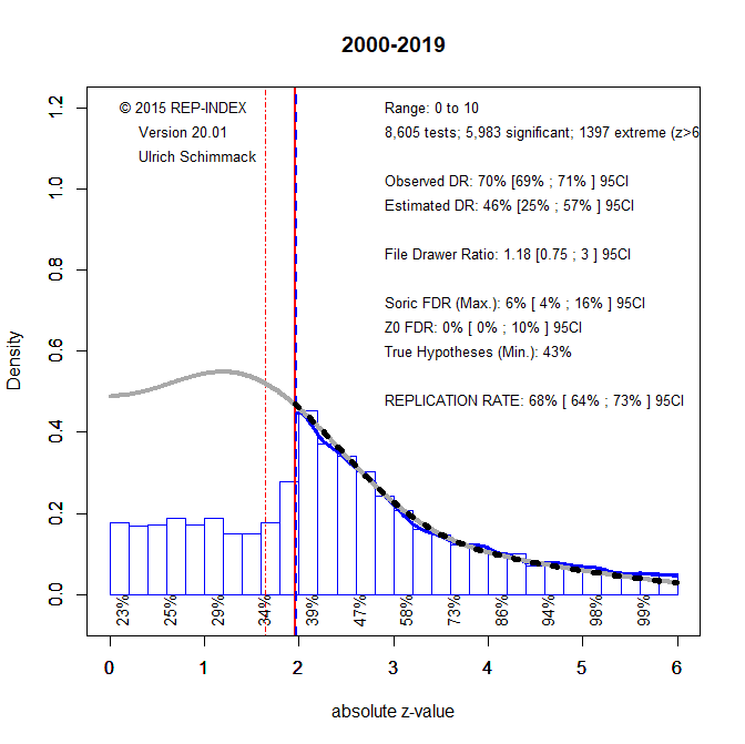 In this blog post, I examine the replicability of results published in BJSP and I examine whether changes in submission guidelines have increased replicability. To do so, I downloaded articles from 2000 to 2019 and automatically extracted test-statistics (t-values, F-values) from those articles. All test-statistics were converted into absolute z-scores. Higher z-scores provide stronger evidence against the nil-hypothesis. I then submitted the 8,605 z-scores to a z-curve analysis. Figure 1 shows the results.