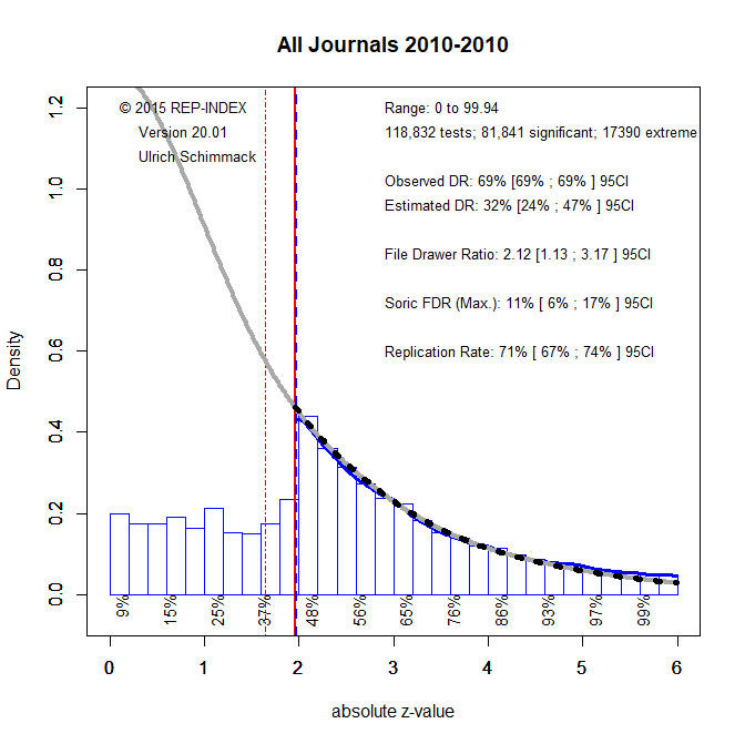 The expected replication rate is 71%, 95%CI = xx xx . This is much higher than the estimate of 37% based on the Open Science Collaboration project (Science, 2015). However, there are two caveats. First, the present analysis is based on all reported statistical tests, including manipulation checks that should produce very strong evidence against the null-hypothesis. Results for focal and risky hypothesis tests will be lower. Second, the ERR assumes that studies can be replicated exactly. This is typically not the case in psychology (Lykken, 1968; Stroebe & Strack, 2014). Bartos and Schimmack (2020) found that the EDR was a better predictor of actual replication outcomes. Assuming that this finding generalizes, the present estimate of 32% would be consistent with the Open Science Collaboration results of 37%.