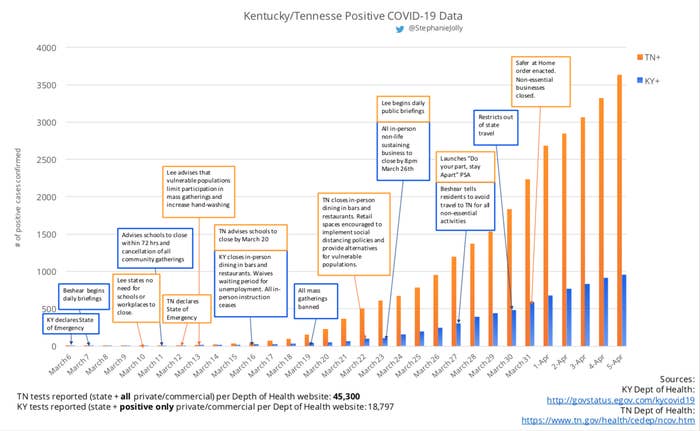 “There is no need to rely on the hypothetical calculations that we have described. The recent divergence of epidemics in Kentucky and Tennessee shows that even a few days’ difference in action can have a big effect. Kentucky’s social distancing measure was issued March 26; Tennessee waited until the last minute of March 31. As Kentucky moved to full statewide measures in reducing infection growth, Tennessee was usually less than a week behind. But as of Friday, the result was stark: Kentucky had 1,693 confirmed cases (379 per million population); Tennessee had 4,862 (712 per million)”