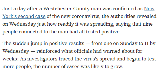 The most important news was that positive results skyrocketed by more than 1,000 cases in one day, which implies that cases nearly doubled in one day (NYT.3.18).