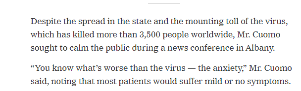 Another article also still sounds optimistic about the fate of NYC. “New York City, of course, has not faced the cataclysmic impact of the virus that has been visited upon areas of China or Iran or Italy, and government officials are scrambling to ensure it remains that way” (NYT.3.7.b).
