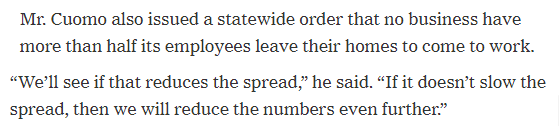 Despite the severity of the model predictions, Cuomo did not issue a stay at home order. The New York Times reports about disagreement between New York’s major and governor Cuomo, with Cuomo explicitly opposing more drastic measures (NYT.3.17.b).