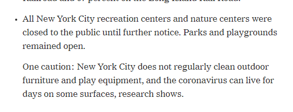 A New York Times article reports that parks and playgrounds remain open (NYT.3.18.b).