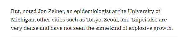 Maybe Asian urban cities were spared because Asian countries were very good at keeping Covid-19 out of their countries or in South Korea’s case control the outbreak before it reached Seoul. However, other big cities in North America like Chicago or Toronto have also not seen the same level of cases or deaths as New York.