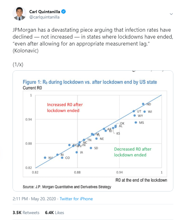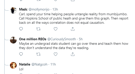 Empirical science rely on data and data analysis. However, data are only necessary and not sufficient to turn a graph into science. Science also requires proper interpretation of the results and honest discussion of their limitations. It is true that New York has more Covid-19 deaths than South Dakota. It is also true that some states like South Dakota never imposed severe restrictions. This does not imply that stay-at-home orders in New York caused more Covid-19 deaths. Similarly, the lack of a correlation between Covid-19 policies and Covid-19 cases or deaths across US states does not imply that these policies have no effect. Another explanation is that there are no states that had many deaths and did not impose stay-at-home orders. For this reason, experts have relied on models of epidemics to simulate scenarios what would have happened if New York City had not closed schools, bars, and night clubs. These simulations suggest that the death toll would have been even greater. The same simulations also suggest that many more lives could have been saved if New York City had been closed down just one week earlier (NPR). Models may sound less scientific than hard data, but data are useless and can be misleading when the necessary information is missing. The social-distancing measures that were imposed world-wide did reduce the death toll, but it is not clear which measures reduced it by how much. The coming months may provide some answers to this questions. S. Korea quickly closed bars after one super spreader infected 40 people in one night (businessinsider). What will happen in Oklahoma where bars and nightclubs are reopening? Personally, I think the political conflict about lock-downs is unproductive. The energy may be better spend on learning from countries that have been successful in controlling Covid-19 and who are able to ease restrictions.