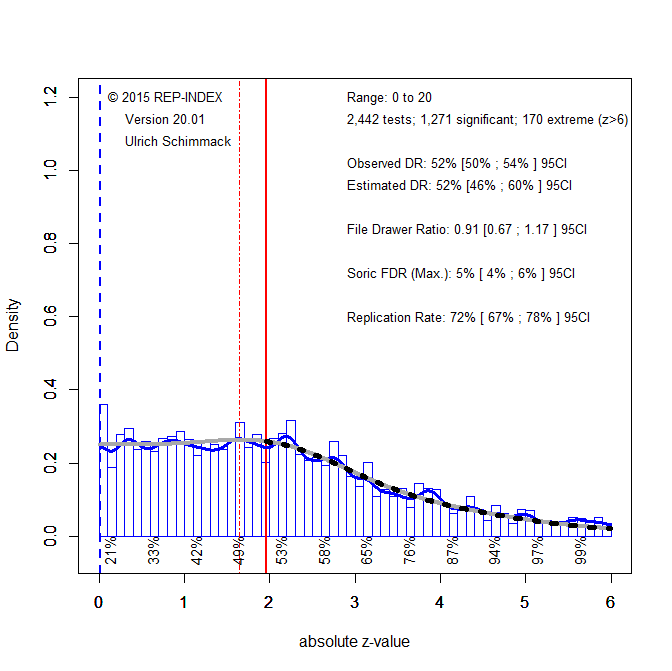 The picture is a bit better for studies with a significant result. Here the average power called the expected replication rate is 71% and the 95% confidence interval approaches 80%. Thus, we would expect that more than 50% of significant results in intelligence research can be replicated with a significant result in the replication study. This estimate is higher than for social psychology, where the expected replication rate is only 43%.
