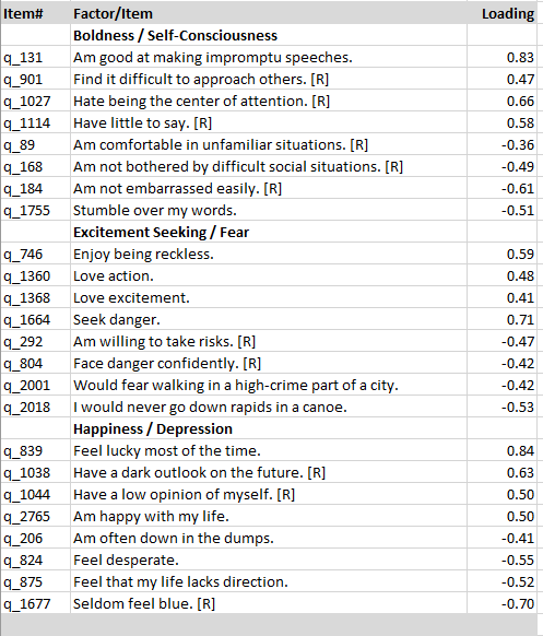 Table 2 shows the items and their primary loadings for the Extraversion facets.