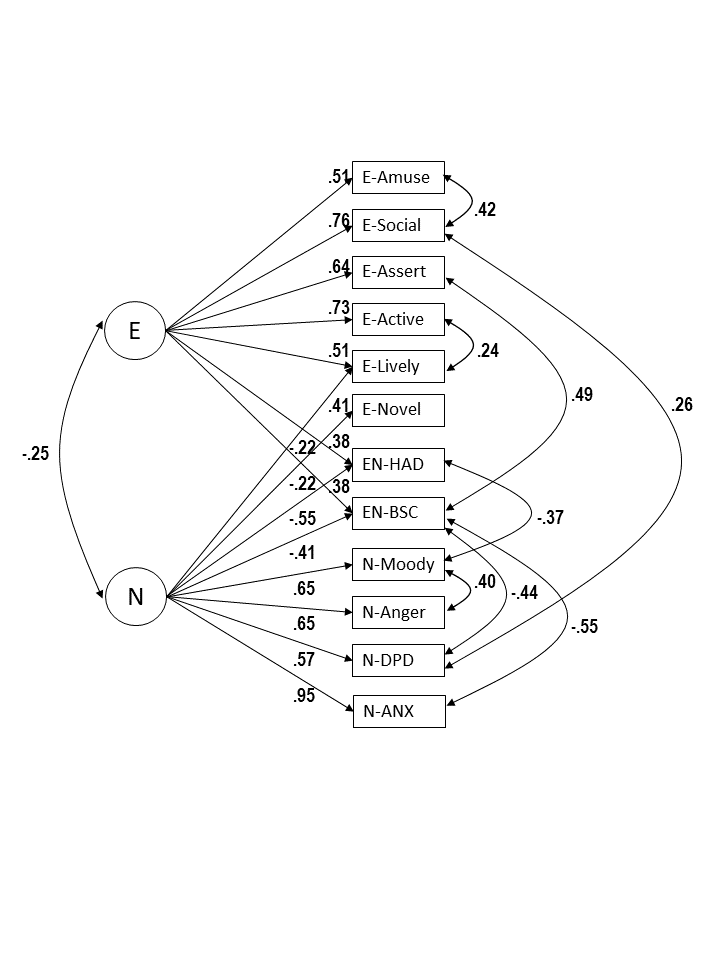 In conclusion, the present study examined the structure of affective traits using hierarchical CFA. The results broadly confirm the Big Five model of personality. Neuroticism represents shared variance among several negative affective traits like anxiety, anger, and depression, and self-conscious emotions. Extraversion is a broader trait that includes affective and non-affective traits. The core affective traits are happiness and positive energy (liveliness). Extraversion and Neuroticism are only slightly negatively correlated and this correlation could be inflated by rating biases. Thus, it is reasonable to conceptualize them as largely independent higher-order traits. However, at the facet level, the structure is more complex and does not fit a simple structure. Some E-facets and N-facets are highly negatively correlated and could be conceptualized as opposite ends of a single trait, namely Happiness-Depression, Boldness-Self-Consciousness, and Excitement-Seeking vs. Fear. It is therefore questionable to classify Happiness, Boldness, and Excitement-Seeking under Extraversion and Depression, Self-Consciousness and Fear under Neuroticism. These traits are related to Extraversion and Neuroticism. The present results do not provide explanations for the structure of affective trait. The main contribution is to provide a description of the structure that actually represents the structure in the data. In contrast, many prominent models are overly simplistic, focus on subsets of facets, and do not fit the data. The present results integrate these models into one general model that can stimulate future research.