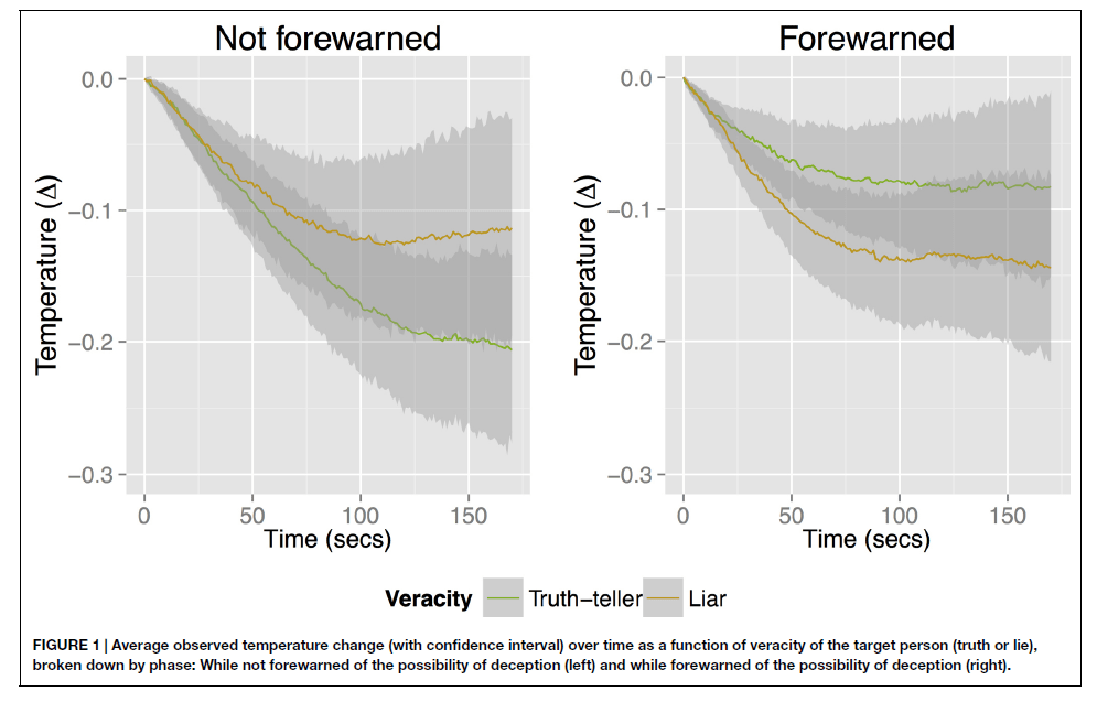 “We found that finger skin temperature consistently decreased while observing a liar. When participants were observing a truth-teller, however, their finger skin temperature decreased more than it did for liars in the phase where participants did not have the goal to detect deception. In contrast, participant’s finger skin temperature stayed higher when observing a truth-teller compared to a liar when participants did have the goal to detect deception” (p. 7).