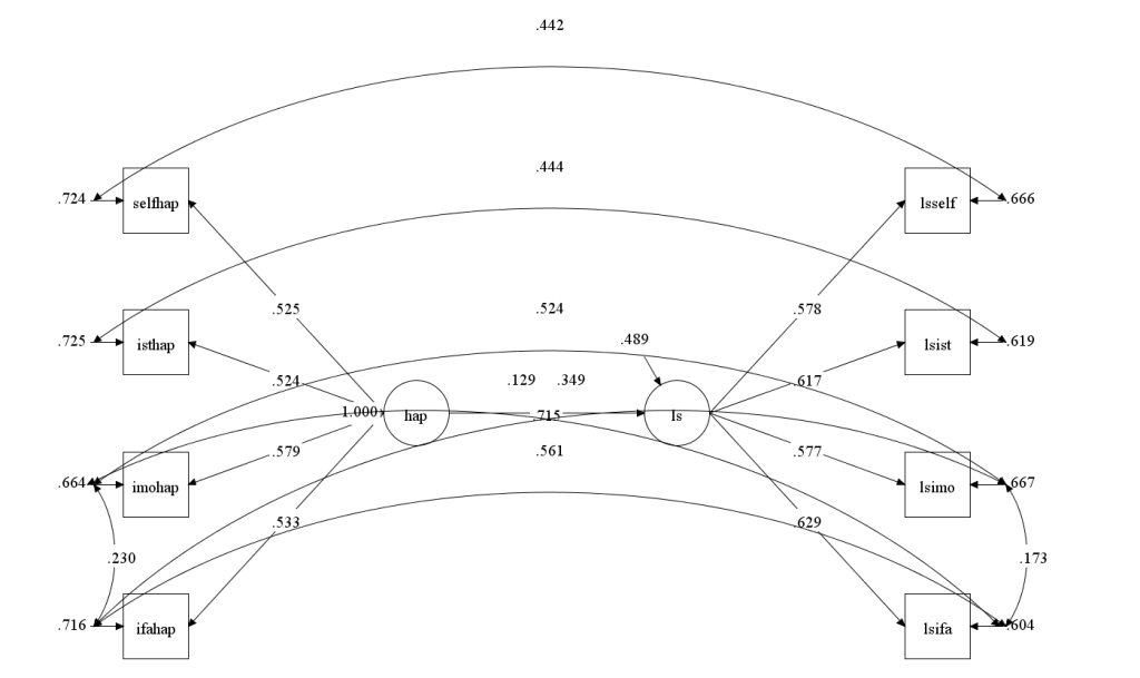 The autogenerated model looks fine because it doesn’t include the correlated errors. The actual model included these errors. The fit of the model was acceptable, CFI = .989, RMSEA = .029. The correlation between happiness and sadness was r = -.59, which is similar to results in the only two multi-method studies of this relationship (Diener, Smith, & Fujita, 1995; Zou et al., 2013). The residual (unexplained) variance in well-being was 37%. Thus, affect explains roughly two-thirds of the valid variance in well-being, but one-third is not explained by affect.