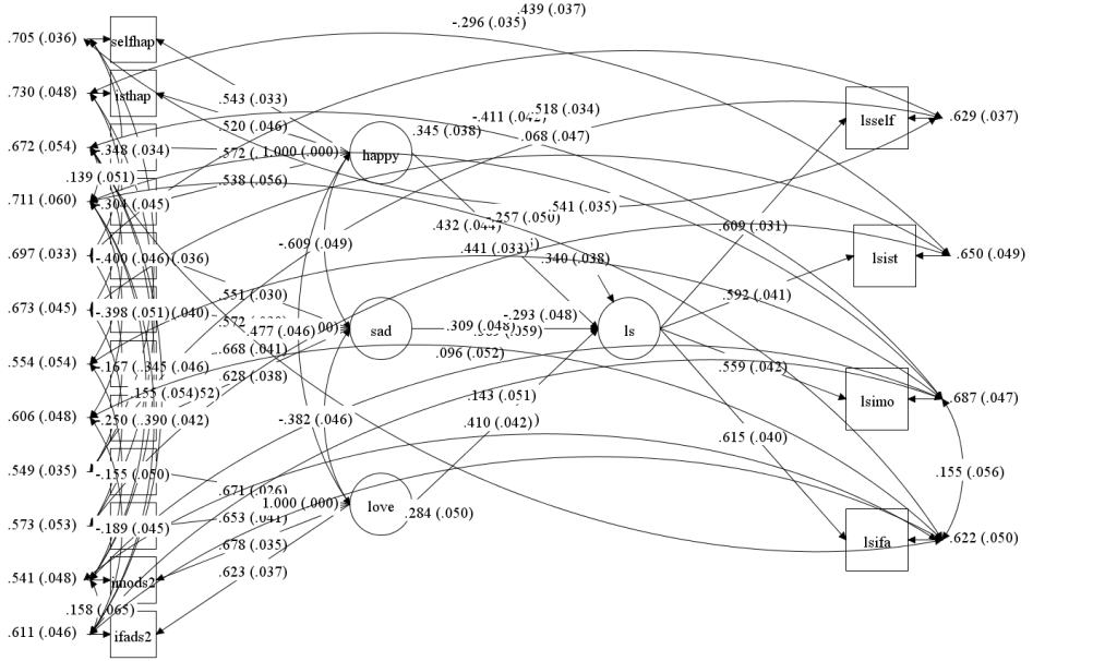 With some tricks, we can create unobserved variables that represents the variance in happiness and sadness that is not explained by life domains and then test the indirect effect of these variables on well-being. (the trick is to create a residual and remove the default residuals. Then the created residual can be treated like any other latent variable and be specified in the model indirect function). The results show virtually no effect for the unique variance in happiness, r = .05, z = 1.3 , but a small and significant effect for the unique variance in sadness, r = -.19, z = 5.6. This shows that the hedonic model of well-being has some serious problems (Schimmack et al., 2002). Rather than relying on their feelings to judge their lives, individuals seem to feel happy or sad when their lives are going well in important life domains.