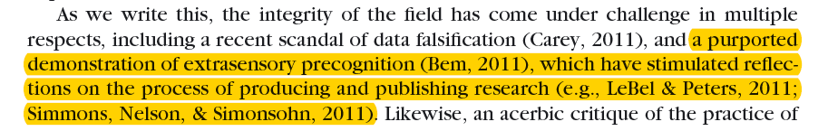 mention QRPs (John et al., 2012) and describe Bem’s results as questionable, but do not mention that Bem used QRPs.