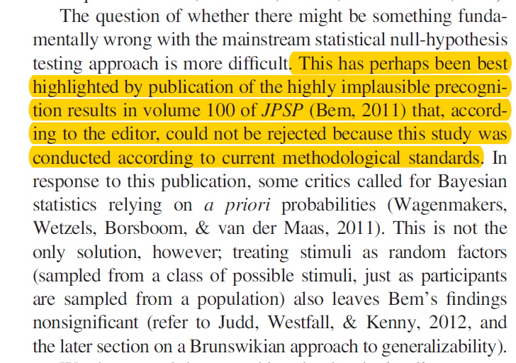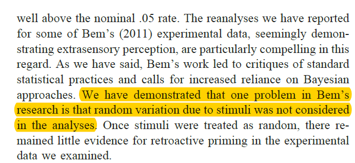 This article implies that the problem was inappropriate treatment of variation across stimuli. It does not mention the use of QRPs in social psychology, nor does it mention evidence that Bem (2011) used QRPs (Francis, 2012; Schimmack, 2012).