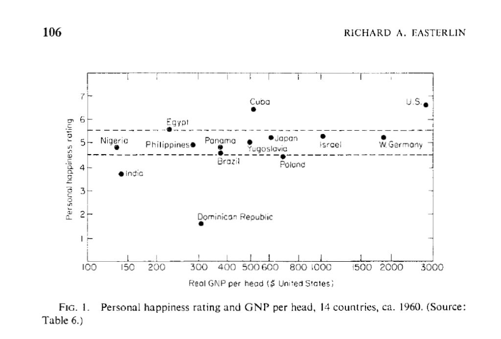 “Actually the association between wealth and happiness indicated by Cantril”s international data is not so clear-cut. This is shown by a scatter diagram of the data (Fig. I). The inference about a positive association relies heavily on the observations for India and the United States. [According to Cantril (1965, pp. 130-131), the values for Cuba and the Dominican Republic reflect unusual political circumstances-the immediate aftermath of a successful revolution in Cuba and prolonged political turmoil in the Dominican Republic].