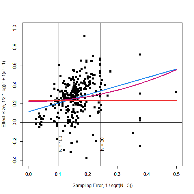 The effect size estimate for the random effects model that ignores publication bias is z = .340, 95%CI = .317 to .363. This would be a moderate effect size (d ~ .6). The model also shows a moderate amount of heterogeneity, I2 = 33.48%. Adding sampling error as a predictor dramatically changes the results. The effect size estimate is now practically zero, z = .020. and the 95%CI is small enough to conclude that any effect would be small, 95%CI = -.048 to .088. Moreover, publication bias fully explains heterogeneity, I2 = 0.00%. Based on this finding, it is not recommended to use the variance as a predictor (Stanley, 2017). However, for the sake of comparison, Figure 1 also shows the results for this model. The red curve shows that the model makes similar predictions in the middle, but overestimates effect sizes for large samples and for small samples. Thus, the intercept is not a reasonable estimate of the average effect size, z = .183, 95%CI = .144 to .222. In conclusion, the new coding shows clearer evidence of publication bias and even the unweighted analysis shows no evidence that the average effect size differs from zero.