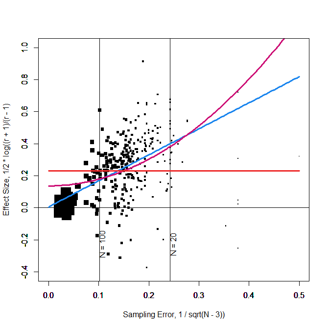A simple solution to this problem is to weight observations by sample size so that larger samples are given more weight. This is actually the default option for many meta-analysis programs like the metafor package in R (Viechbauer, 2010). Thus, I reran the same analyses with weighting of observations by sample size. Figure 2 shows the results. In Figure 2 the size of observations reflects weights. The most important difference in the results is that the intercept for the model with a linear effect of sampling error is practically zero and not statistically significant, z = .006, 95%CI = -.040 to .052. The confidence interval is small enough to infer that the typical effect size is close enough to zero to accept the null-hypothesis.