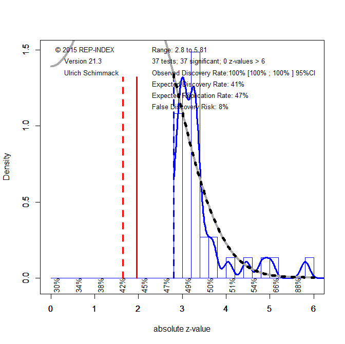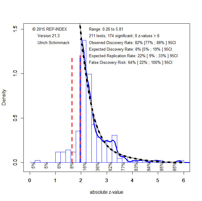 The expected discovery rate can be compared to the observed discovery rate to assess the amount of publication bias. The observed discovery rate is simply the percentage of significant results for the 128 studies. The observed discovery rate is 83% and would be even higher if marginally significant results, p < .10, z > 1.65, were counted as significant. Thus, the observed discovery rate is 10 times higher than the expected discovery rate. This shows massive publication bias.