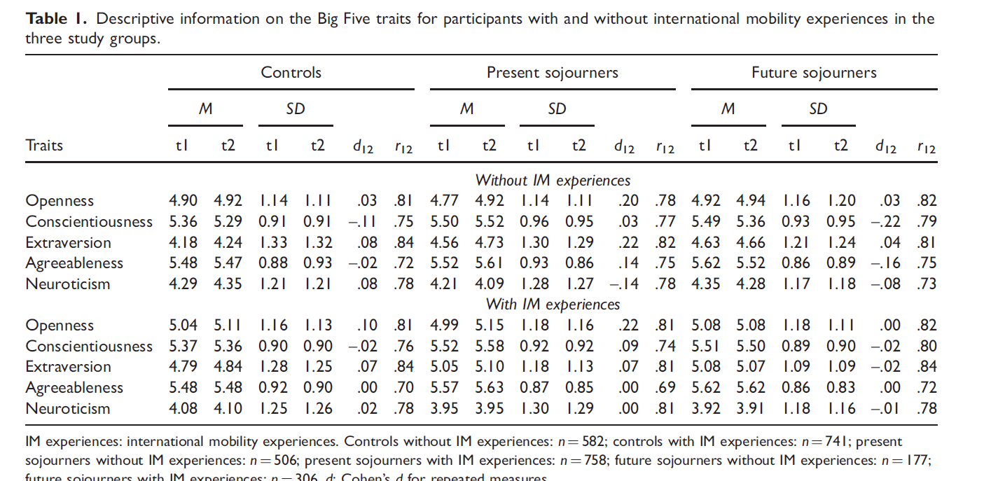 Another symptom of paradigmatic research is that interpretations of research findings do not fit the data. Zimmermann et al. (2021) conducted an impressive study of N = 3,070 students’ personality over the course of a semester. Some of these students stayed at their university and others went abroad. The focus of the article was to examine the potential influence of spending time abroad on personality. The findings are summarized in Table 1.