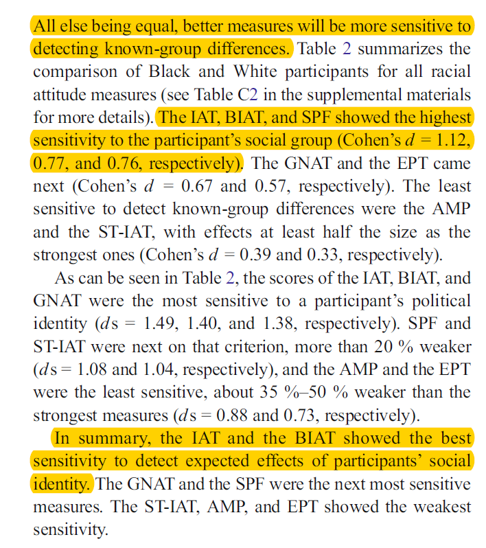 (6) It has been a while since I read the Bar-Anan and Nosek (2014) article, but my memory for it is incompatible with the claim that those authors were foolish enough to simply assume that the most valid implicit measures was the one that produced the biggest difference between Whites and Blacks in terms of in-group bias, as the present authors claim (pp. 7-8).