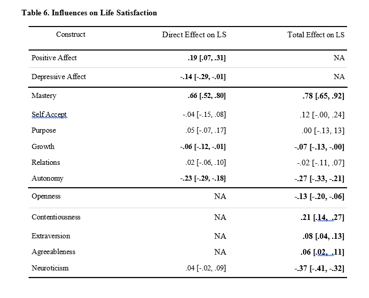 Other noteworthy findings were that none of the other PWB attribute made a positive (direct or indirect) contribution to life-satisfaction judgments. Autonomy even was a negative predictor. The effects of positive affect and negative affect were statistically significant, but small. This suggests that PA and NA are meaningful indicators of subjective well-being because the reflect a good life, but provide no evidence for hedonic theories of well-being that suggest positive affect increases well-being no matter how it is elicited.