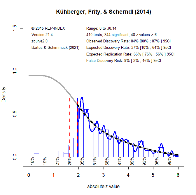 We now turn to real data. Figure 3 shows a z-curve analysis of Kühberger, Frity, and Scherndl (2014) data. The authors conducted an audit of psychological research by randomly sampling 1,000 English language articles published in the year 2007 that were listed in PsychInfo. This audit produced 344 significant p-values that could be subjected to a z-curve analysis. The results differ notably from the previous results. The expected discovery rate is higher and implies a much smaller false discovery risk of only 9%. However, due to the small set of studies, the confidence interval is wide and allows for nearly 50% false positive results.