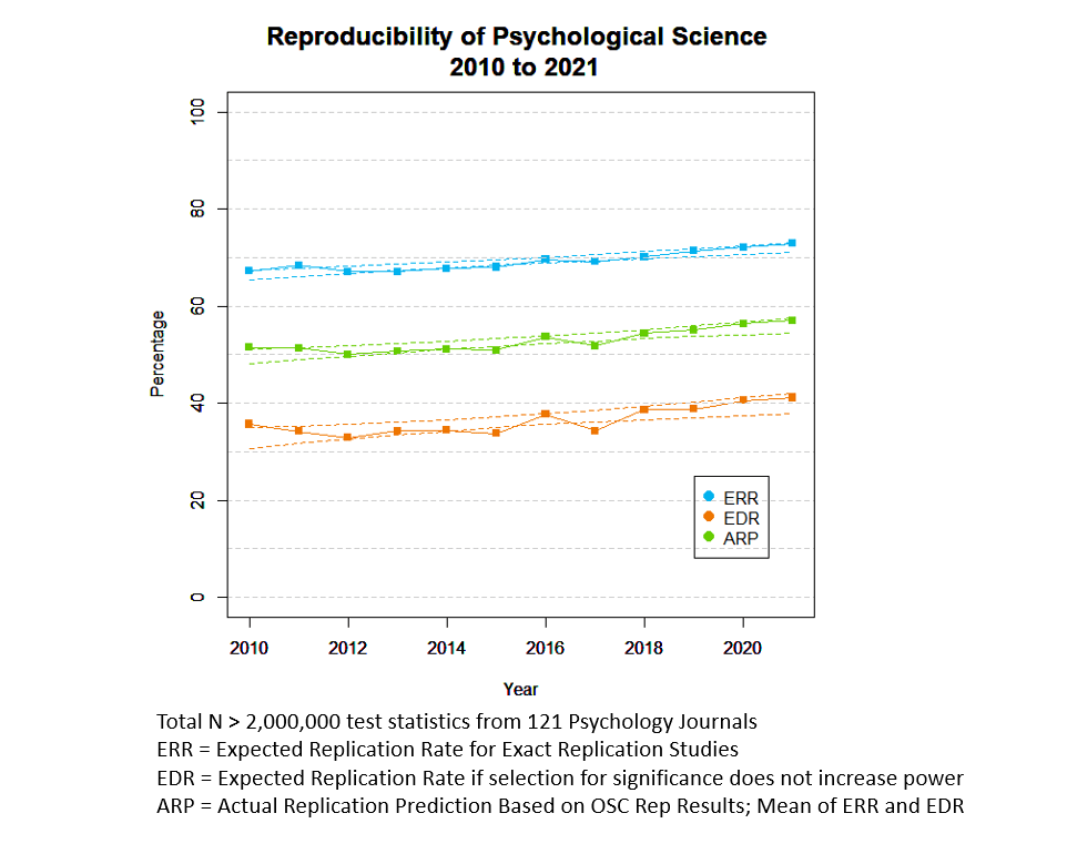 Figure 1 shows the average ARP, ERR, and EDR for a broad range of psychology journals. Given the large number of test statistics in each year (k > 100,000), the estimates are very precise. The dashed lines show the 95%CI around the linear trend line. The results show that the ARP has increased from around 50% to slightly under 60%. This finding shows that results published in psychological journals have become a bit more replicable, although this prediction needs to be verified with actual replication studies.