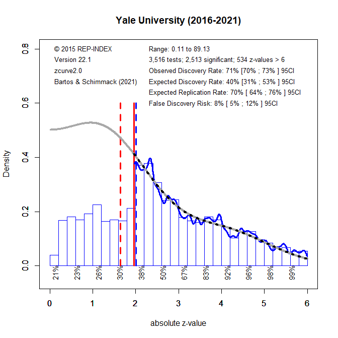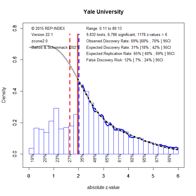 3. To quantify the amount of selection bias, z-curve fits a statistical model to the distribution of statistically significant results (z > 1.96). The grey curve shows the predicted values for the observed significant results and the unobserved non-significant results. The statistically significant results (including z > 6) make up 31% of the total area under the grey curve. This is called the expected discovery rate because the results provide an estimate of the percentage of significant results that researchers actually obtain in their statistical analyses. In comparison, the percentage of significant results (including z > 6) includes 69% of the published results. This percentage is called the observed discovery rate, which is the rate of significant results in published journal articles. The difference between a 69% ODR and a 31% EDR provides an estimate of the extent of selection for significance. The difference of~ 40 percentage points is fairly large. The upper level of the 95% confidence interval for the EDR is 42%. Thus, the discrepancy is not just random. To put this result in context, it is possible to compare it to the average for 120 psychology journals in 2010 (Schimmack, 2022). The ODR (69% vs. 72%) and the EDR (31% vs. 28%) are similar. This suggest that the research produced by Yale faculty members is neither more nor less replicable than research produced at other universities.