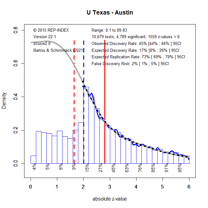 4. The z-curve model also estimates the average power of the subset of studies with significant results (p < .05, two-tailed). This estimate is called the expected replication rate (ERR) because it predicts the percentage of significant results that are expected if the same analyses were repeated in exact replication studies with the same sample sizes. The ERR of 66% suggests a fairly high replication rate. The problem is that actual replication rates are lower than the ERR predictions (about 40% Open Science Collaboration, 2015). The main reason is that it is impossible to conduct exact replication studies and that selection for significance will lead to a regression to the mean when replication studies are not exact. Thus, the ERR represents the best case scenario that is unrealistic. In contrast, the EDR represents the worst case scenario in which selection for significance does not select more powerful studies and the success rate of replication studies is not different from the success rate of original studies. The EDR of 27% is lower than the actual replication success rate of 40%. To predict the success rate of actual replication studies, I am using the average of the EDR and ERR, which is called the actual replication prediction (ARP). For UT Austin, the ARP is (66 + 27)/2 = 47%. This is just a bit above the currently best estimate of the success rate for actual replication studies based on the Open Science Collaboration project (~40%). Thus, UT Austin results are expected to replicate at the average rate of psychological research.
