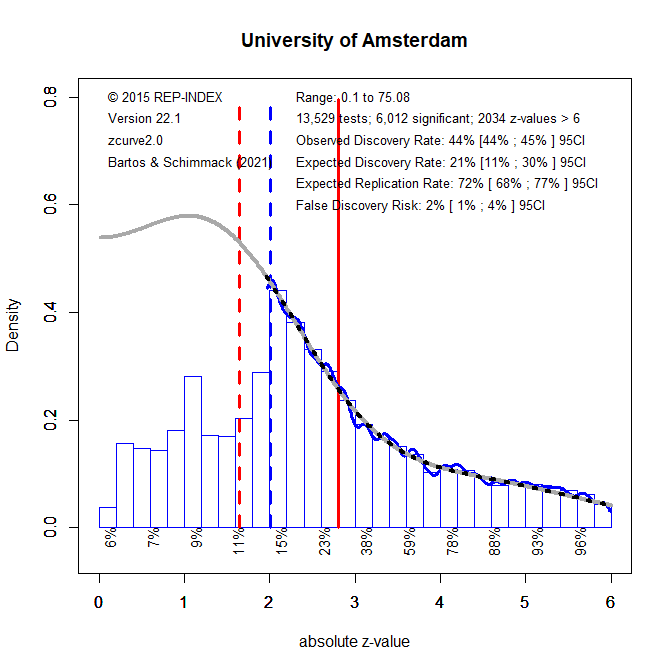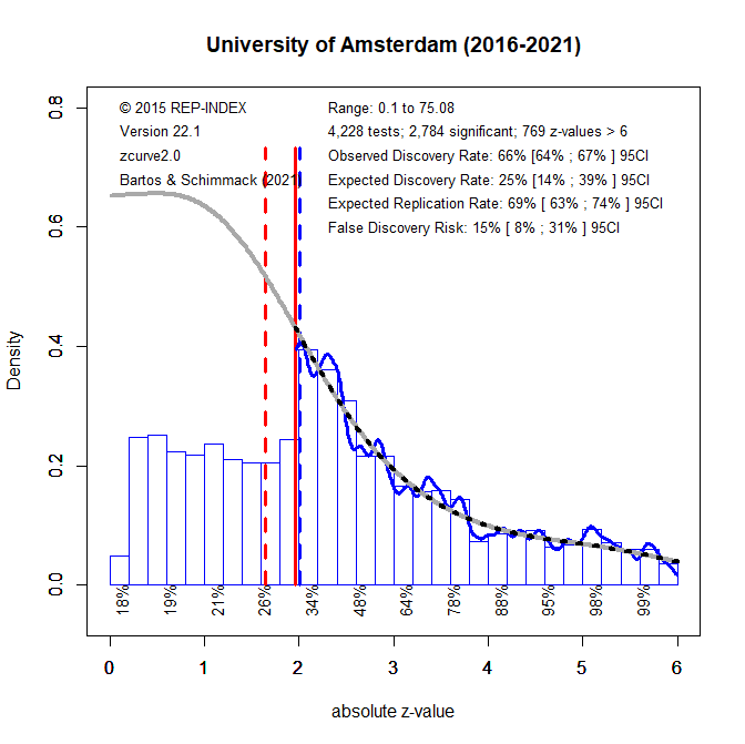 4. The z-curve model also estimates the average power of the subset of studies with significant results (p < .05, two-tailed). This estimate is called the expected replication rate (ERR) because it predicts the percentage of significant results that are expected if the same analyses were repeated in exact replication studies with the same sample sizes. The ERR of 66% suggests a fairly high replication rate. The problem is that actual replication rates are lower than the ERR predictions (about 40% Open Science Collaboration, 2015). The main reason is that it is impossible to conduct exact replication studies and that selection for significance will lead to a regression to the mean when replication studies are not exact. Thus, the ERR represents the best case scenario that is unrealistic. In contrast, the EDR represents the worst case scenario in which selection for significance does not select more powerful studies and the success rate of replication studies is not different from the success rate of original studies. The EDR of 35% is below the actual replication success rate of 40%. To predict the success rate of actual replication studies, I am using the average of the EDR and ERR, which is called the actual replication prediction (ARP). For the University of Amsterdam, the ARP is (70 +35)/2 = 53%. This is somewhat higher than the currently best estimate of the success rate for actual replication studies based on the Open Science Collaboration project (~40%). Thus, research from the University of Amsterdam is expected to replicate at a higher rate than the replication rate for psychology in general.