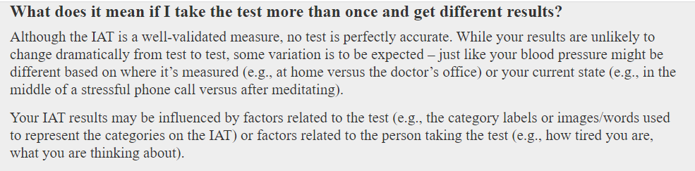 However, the Project Implicit website gives the false impression that performance on IATs is rather consistent, while avoiding quantitative information about reliability.