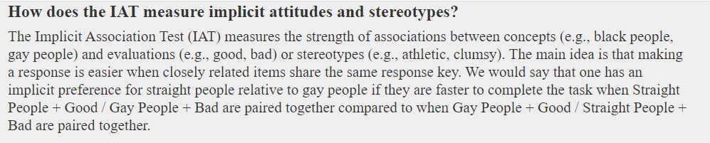 The Project Implicit website does not provide a clear explanation of what Implicit association Tests test. Regarding the race IAT, visitors are told that it is not a measure of prejudice, but that it does measure their biases, even if these biases are not endorsed or contradict conscious beliefs.