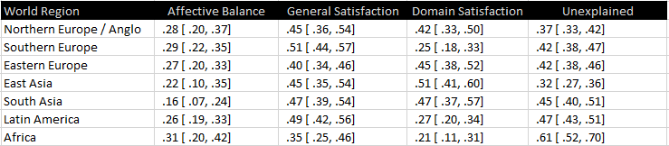 Table 5 shows the differences between world regions in the components that contribute to subjective life-evaluations. In this table values for global satisfaction are means, whereas the other values are intercepts that remove the influence of global satisfaction differences and domain specific differences for PA and NA and the influence of all predictors for life-satisfaction.