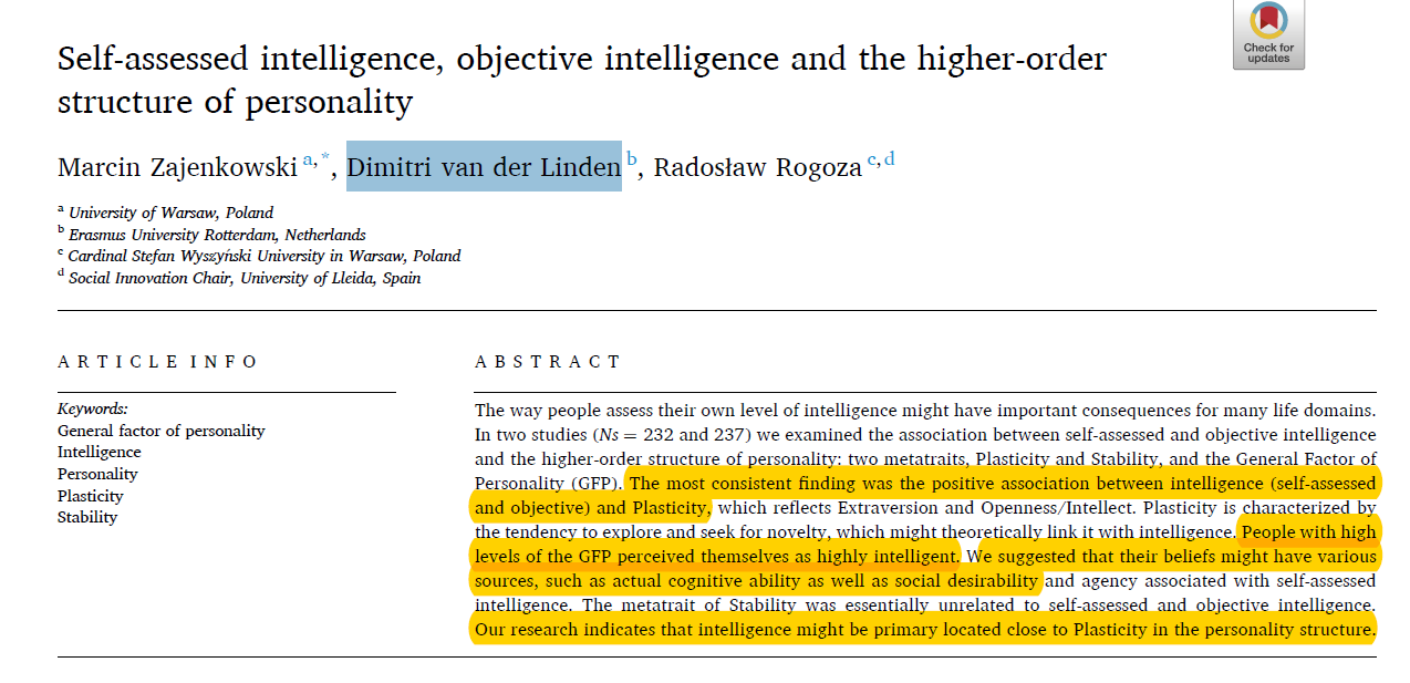 Despite this evidence, some personality psychologists argue that the Big Five are related to each other by substantive traits. One model assumes that there are two higher-order factors. One factor produces a positive correlation between extraversion and openness and another factor produces positive correlations between Emotional Stability (low Neuroticism), Agreeableness, and Conscientiousness. These two factors are supposed to be independent (DeYoung, 2006). Another model proposes a single higher-order factor that is called the General Factor of Personality (GFP). This factor was originally proposed by Musek (2007) and then championed by the late psychologists Rushton. Plank suggested that bad theories die after their champion dies, but in this case Dimitri van der Linden has taken it upon himself to keep the GFP alive. I have met Dimitri at a conference many years ago and discussed the GFP with him, but evidently my arguments fell on deaf ears. My main point was that you need to study factors with factor analysis. A simple sum score of Big Five scales is not a proper way to examine the GFP because this sum score also contains variance of the specific Big Five factors. Apparently, he is too stupid or lazy to learn structural equation modeling to use CFA in studies of the GFP.