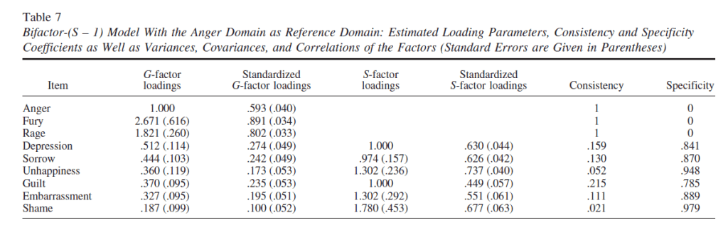 A proper bi-factor or hierarchical model would test the substantive theory that some emotions covary because they share a common feature. The most basic feature of emotions is assumed to be valence. Based on this theory, emotions with the same valence are more likely to co-occur , which results in positive correlations among emotions of the same valence. Hundreds of studies have confirmed this prediction. In addition, emotions also share specific features such as appraisals and action tendencies. Emotions who also share these components are more likely to co-occur than emotions with different or even opposing appraisals. For example, pride and gratitude are based on opposing appraisals of attribution to self or others. A measurement model of emotions might represent these assumptions in a model with one or two general factors for valence (the dimensionality of valence is still debated) and several specific factors. In this model, the general factor has a clear meaning and represents the valence of an emotion. Fitting such a model to the data is useful to test the theory. Maybe the results confirm the model, may be they don’t. Either way, we learn something about human emotions. But if we fit a model that does not include a factor that represents valence and misleadingly label an anger-factor a general factor, we learn nothing, except that we should not trust psychometricians who build models without substantive expertise. Sadly, Eid has actually made good contributions to emotion research in the 1990s that has identified broad general factors of affect that he appears to have forgotten. Accordingly, he would have modeled affect along three general dimensions (Steyer, Schwenkmezger, Notz, & Eid, 1997).