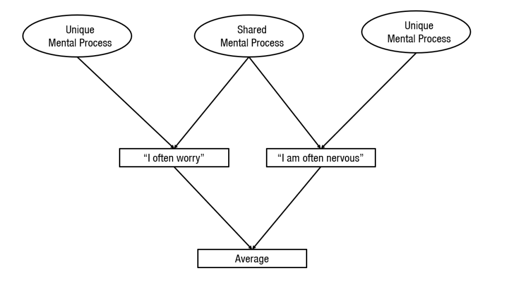 To use the average of responses to similarly worded items as an observed measure of an unobserved personality trait, we have to assume that the shared mental processes that produce most of the variance in the average scores are caused by the personality trait that we are trying to measure. In the present example, personality psychologists use items like “worry” and “nervous” to measure a trait called Neuroticism. Despite 100 years of research, it is still not clear what Neuroticism is and some psychologists still doubt that Neuroticism even exists. Those who do believe in Neuroticism assume it reflects a general disposition to have more negative thoughts (e.g., low self-esteem, pessimism) and feelings (anxiety, anger, sadness, guilt). The main problem in current personality research is that item-averages are often treated as if they are perfect observed indicators of an unobserved personality trait (see next figure).