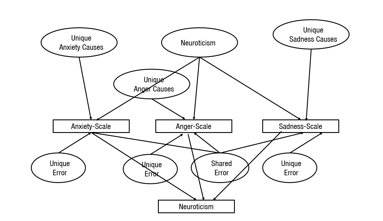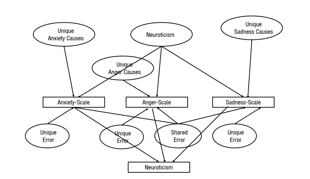 In the 1980s, personality psychologists came to a broad consensus that the diversity of human traits (e.g., anxious, bold, curious, determined, energetic, frank, gentle, helpful, etc.) can be organized into a taxonomy with five broad traits, known as the Big Five. The basic idea is illustrate in the next Figure with Neuroticism. According to Big Five theory, Neuroticism is a general disposition to experience more anxiety, anger, and sadness. However, each emotion also has its one dispositions. Thus, variation in scales that measure anxiety, anger, and sadness is influenced by both Neuroticism (i.e., the general disposition) and specific causes. In addition, scales can also be influenced by general and specific measurement errors. The figure makes it clear that the scores in the item-averages can reflect many different causes aside from the intended broader personality trait called Neuroticism. This makes it risky to rely on these item averages to draw inferences about the unobserved variable Neuroticism.