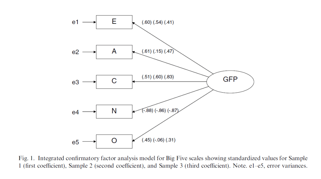 First, it is notable that the unique mental processes that contribute to each of the Big Five scales are called e1 to e5 and the legend of the figure explains that e stands for error variances. This terminology can be justified if we treat Big Five scales only as observed variables that help us to observe the unobserved variable GFP. As GFP is not directly observable, we have to infer its presence from the correlations among the observed variables, namely the Big Five scales. However, labeling the unique causes that produce variation in Neuroticism scores error variance is dangerous because we may think that the unique variance in Neuroticism is no longer important; just error. Of course, this variance is not error variance in some absolute sense. After all, Neuroticism scales exists only because personality psychologists assume that Neuroticism is a real personality trait that is related to even more specific traits like anxiety, anger, and sadness. Thus, all of the variance in a neuroticism scale is assumed to be important and it would be wrong to assume that only the variance shared with other Big Five scales is important. To avoid this misinterpretation, it would be better to keep the unique causes in the model.
