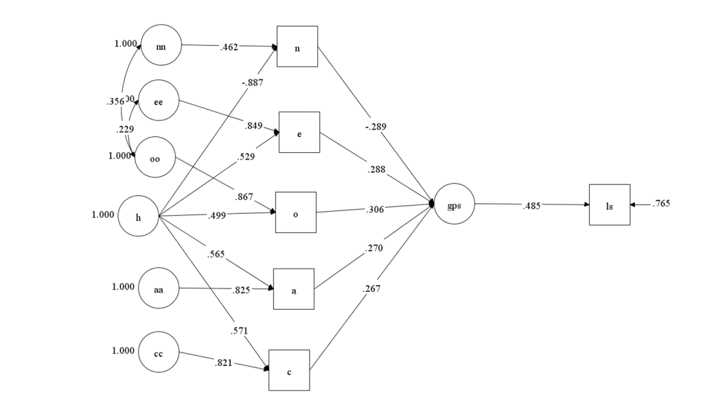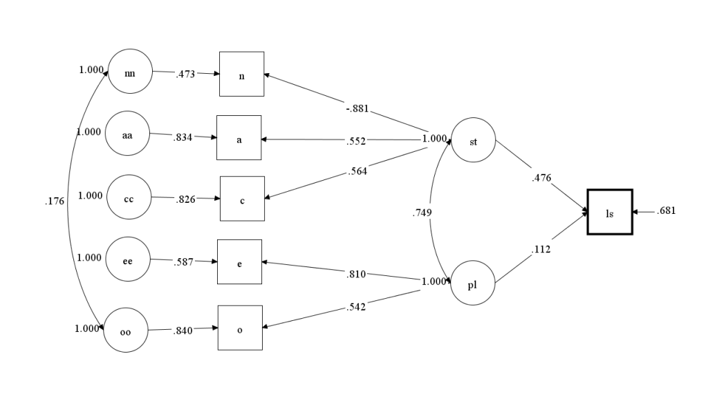 In fact, it is possible to find an even better fitting model because only two of the five Big Five scales were significant predictors of life-satisfaction. This finding is consistent with many previous studies that these two Big Five traits are the strongest predictors of life-satisfaction. If the model is limited to these two predictors, it fits the data better than the model with a direct path from the general factor, CFI = .987, RMSEA = .045. Musek (2007) was unable to realize that the unique variances in neuroticism and extraversion make a unique contribution to life-satisfaction because the general personality scale does not separate shared and unique causes of variation in the Big Five scales.