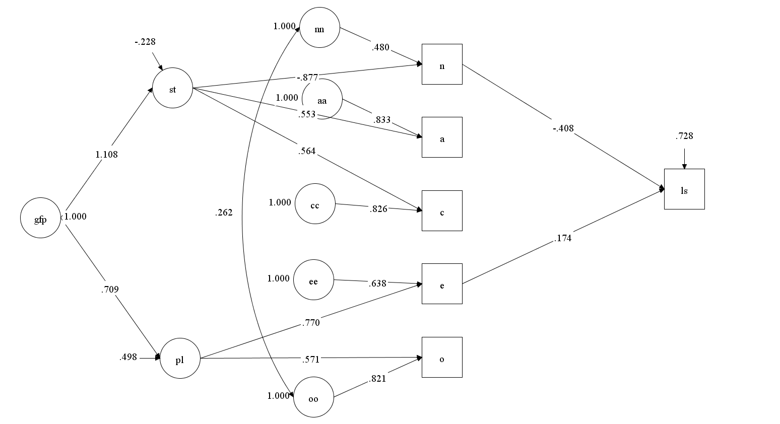 In this model, it is possible to trace the paths from the unobserved variables to life-satisfaction. The strongest relationship was the path from the general personality factor (h) to life-satisfaction, b = .42, se = .04, but the model also implied that unique variances of the Big Five scales contribute to life-satisfaction. These effects are hidden when the general personality scale is interpreted as if it is a pure measure of the general personality factor.